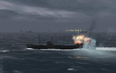 Liniowiec odpowiada ogniem z dział pokładowych, Mój okręt otrzymuje kilka trafień i zanurzam się aby zaatakować, w tym samym momencie w okolicach rufy liniowca widać słup wody.