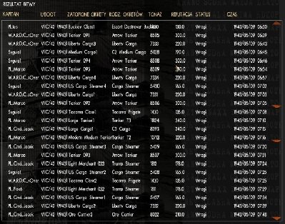 1943 rok, myślałem, że powyrzynają nas jak ...., ale nie było tak źle. Mało tego było aż za dobrze. Chciałem zajść konwój od przodu i powoli ku temu zmierzałem, lecz trwało to bardzo długo. W tym czasie chłopcy zaczęli polowanie, statki eksplodowały jeden po drugim, a ja byłem biernym obserwatorem pokazu sztucznych ogni. Ale i na mnie przyszła kolej. Musiałem tylko bacznie obserwować okolice, bo kolczaste DD-ki (znaczy się z jeżami), pływały jak szalone. Tak więc wysunięcie peryskopu, przycelowanie i strzał. W sumie tylko jedna rybka wybuchła za wcześnie , a pozostałe były w celu. Potem po cichu oddaliłem się z pola bitwy i pozostałem niezauważony. Późno wszedłem do akcji i największe jednostki legły już na dnie.