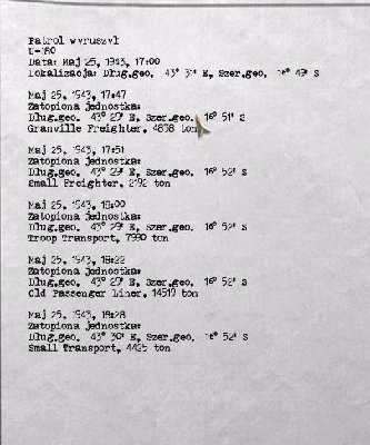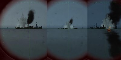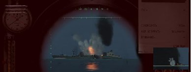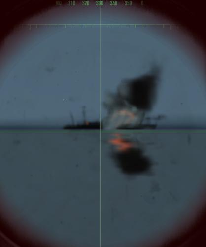 Na powierzchni przed dziobem było sporo szczątków jakichs okrętów, rozbitkowie w pontonach. Dalej jakies 2km stał najwyrazniej uszkodzony nieduży transportowiec. Za nim, moze kilometr dalej przepływal troche wiekszy transportowiec. Po prawej, całkiem blisko mialem rufe oddalającego sie jakiegos malego mercha ktory juz omiatal otoczenie reflrktorami, zapadal zmrok. W Poblizu kursowały dwa okręty eskorty, na oko zidentyfikowalem je jako typ Hunt i jakiś Tribal albo amerykaniec, nie bylo czasu na identyfikacje celów, szybkie ustawienia reczne dla torped. predksc zero, odl 2000metrow i poszla torpeda w tego stojacego przed dziobem. Zaraz potem Identyfikacja tego co plynął za nim i szybki pomiar predkosci, dal wynik 4 wezły. Trzy pozostale torpedy odpalone w ten wiekszy ruchomy cel i zwrot aby z rufy strzelic w ten co ode mnie uciekal a byl calkiem blisko. Pierwsza torpeda trafila ale wczesniej unieruchomiony cel dostal inne trafienia od któregos z naszych i w zasadzie to trafilem tonącego wraka. Trzy torpedy trafily idący wolno dalszy cel, co sybko rozstrzygnęlo jego los. Z rufy puścilem dwi torpedy w lekkim rozchyleniu z zapalnikami magnetycznymi, w tym czasie pierwsza torpeda w dziobowych miala sie juz blisko do przeladowania, a zblizal sie niszczyciel, drugi też nadciągał z boku. Juz słyszałem pingi gdy torpeda zostala przygotowana, strzal z dzioba w dziób nie trafił a odpowiedź wroga okazala sie dla mnie śmiertelna. Zginąlem na głebokości 30m. Zanm zginąlem usłyszałem jedno trafienie z torped wystrzelonych na rufie. Potem zobaczyłem że cel stoi i lekko płonie z podtopiona rufą.