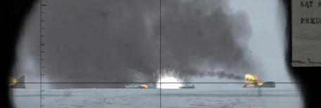 Powoli oddalam się na głębsze wody obserwując pobojowisko za rufą. Wśród kłębów dymu zauważam stojący transportowiec - celna torpeda niszczy jego kadłub i statek tonie. Pojawiają się niszczyciele, które obrzucają miejsce ataku bombami. Ja na szczęście jestem już daleko