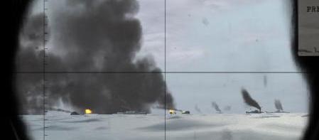 Moze to dzieło przypadku a moze tak mialo byc w misji ale ja gonilem pierwsza godzine cele które nie byly w konwoju tylko gdzies na południu szły. Byly tam dwa statki handlowe, ale szły kursem oddalającym sie i doszedłem do wniosku że nie zdąże ich przechwycic w tych warunkach, bo nasza gra trwa krotko. Wróciłem więc te 10km na pólnoc gdzi ejuz chlopaki cos topili. Troche źle przewidzialem tras ekonwoju bo spodziewalem sie ze bedzie szedl caly czas na poludniowy zachód a tymczasem skrecil na poludniowy wschód i ledwo doszedlem na odleglosc sensownego strzału przed koncem misji, a ze cele zygzakowaly to moje torpedy nie trafily z tak daleka.