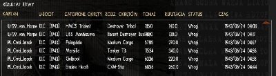 Coś nie tak jest z moim łączem, kolejny przypadek gdy rozłącza mi graczy. Powoli płynęliśmy w górę rzeki. Pierwszy kontakt złapał Szylol, został zaatakowany i pozbawiony obu peryskopów. Udało mu się na szczęście uciec. Harpe otwarł drogę do konwoju topiąc dwa niszczyciele. Już miałem zaatakować frachtowce, gdy padła mi sieć i rozłączyło wszystkich graczy . No nic popłynąłem jeszcze chwilkę i ulokowałem parę torped. Doczekałem końca czasu, a teraz piszę ten raport.