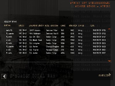 Następny cel C2. Około kilometra. Dane zebrane, dwie T1, poszły. Za rufą. Niech to (wiem, bo jedna wybuchła przedwcześnie). Kąt był dobry, wysłąłem jeszcze 2xT2. Efekt taki sam. Pogoda czy jak ?Chociaż C2 potrafi też całkiem zręcznie zygzakować. Po dłuższym czasie meldunek, "jednostka została zniszczona" . Jedna z torped trafiła Freighter-a, ale to był zupełny fart. A zakończyła mój patrol korweta, która albo zobaczyła mój peryskop, albo doszła po hałasie (załadunek wyrzutni). Uciekłem na 70 metrów; dwie salwy bombek przeżyłem, trzecia była precyzyjna i posłała nas w odmęty. Uniki na głębokościach jeszcze mi nie wychodzą, ale popracujemy i nad tym.