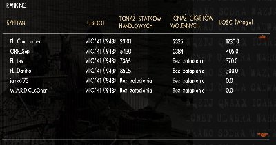 No coż, patrol - jak dla mnie - bardzo wymagający. Udało mi się w końcu coś zatopić, ale to był czwarty cel jaki atakowałem w tym patrolu. Nic nie widziałem - pogoda fatalna (atmosferycznie oczywiście), wysokie fale, zacinający deszcz no i ciemności w pierwszej fazie patrolu. Starałem kierować się na namiary hydro, lecz pomimo bliskich sygnałów po podniesieniu peryskopu nadal nic nie widziałem :) Poza Fletcher`em który w pewnym momencie wyskoczył mi w odległości ok 800 metrów od lewej burty. Nie mam pojęcia jak go nie zauważyłem- mój błąd, że nie poprosiłem hydroakustyka o namiar na najbliższy okręt wojenny. Ma szczęście w tym momencie udawałem próżnię w wodzie a Fletcher mnie nie zauważył anie nie wyniuchał bo byłby koniec.
