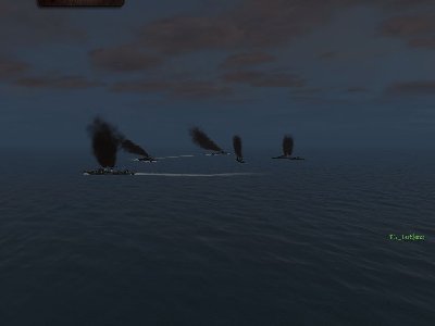 Pierwszy dzień maja przywitaliśmy w pięknie zachodzącym słońcu. Po krótkim pobycie na peryskopowej i zebraniu wszystkich danych można jeszcze było wrócić na powierzchnię i nacieszyć oczy chociaż te pół godziny. Sielanka skończyła się po pojawieniu się pierwszych dymów. Dalej już było "normalnie". Do lewej strony konwoju jakieś 5-6 km. Za daleko żeby rozpoznać jednostkę, nie mówiąc o ataku. Dojście bliżej skutecznie blokowała eskorta z którą nie miałem zamiaru wdawać się w dyskusję. Zupełnie nie niepokojony omijałem kolejne fregaty i niszczyciele będąc już pewien, że patrol zakończy się "jedynie" SURV-em. Ale los się do mnie uśmiechnął podsyłając mi piękny pancernik prawie pod same wyrzutnie. Oczywiście chętnie skorzystałem z okazji, chociaż nie obyło się bez pewnych trudności. Na krótko przed końcem patrolu znów mogłem się wynurzyć żeby odetchnąć. Osobne słowa uznania należą się kpt. Lutjensowi za dzielne stawianie czoła kilku niszczycielom do ostatnich minut patrolu. Dzięki za współny rejs.