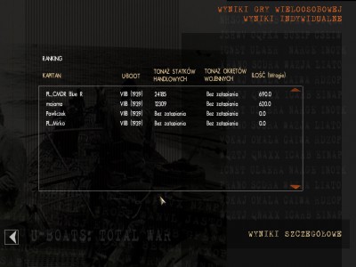 Na początku gry łapię kontakt... Odnajduję konwój i atakuję z flanki. 1 przedwczesna, 1 pudło i 2 trafienia w 1 z dwóch celów. Zatrzymał się... To dobitka... Tonie. HUNT się kręci w pobliżu... Wykrył mnie, gdy torpedowałem drugi cel, który zatonął potem na równej stępce, jakby ktoś go pociągnął. Ale musiałem wiać na głębinę (100m). Pawliczek traci połączenie z netem i wylatuje