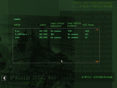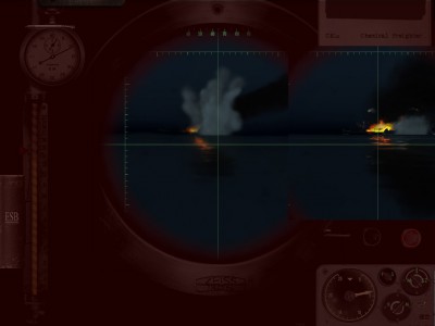 Po pół godzinie 40m pod kilem i widzę konwój. Ale podczas mijania DD (1.jpg) przepływałem za blisko i puścił jednego pinga... Myślałem, że nie znajdzie mnie, ale po nawrocie wykrył mnie. Wiedziałem, że będzie gorąco, a stałem bokiem do konwoju. Posłałem 6 torped do lotniskowców... Zaliczyłem 1 przedwczesną i 2 niewypały. Zjeżdżają się DD. Uciekam między statki i płynę w kierunku głębiny, bo okręt dęba nie zmieściłby się tu. Patrzę za siebie. Nagle woda zalewa peryskop i widzę elektryczną torpedę!! JEBUT! (2.pg). Będzie gorąco! Podczas napraw przeładowałem torpedy (2), więc szybkie rozejrzenie się. Widzę małego chemikaliowca. Posłałem mu 2 torpedy. Wyleciał po pierwszej. (3.jpg). A dla mnie zaczęła się ucieczka. Byłem na miejscu z 40m głębokości, gdy DD napłynął na mnie. Bomby rzucały mnie mocno... I urwały rufowe stery... Wtedy myślałem, że to koniec (4.jpg). Bez możliwości uniku, zszedłem na dno i powoli uciekałem... 2 razy mocno trzęsło okrętem. Raz eksplozja wepchnęła mnie w dno... Ale potem.... DD mnie zgubił... I po 30 minutach dał spokój... Szczęśliwie byłem zwrócony na Hokkaido i mogłem sam wrócić do bazy.