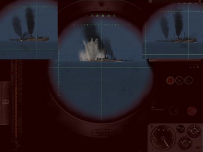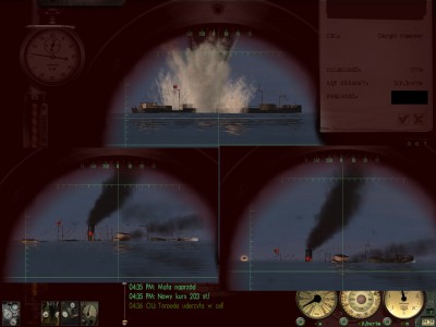 Wszedłem od boku i posłałem torpedę do Trampa... Dostał i pięknie zatonął.. (1.jpg). To posłałem drugą do drugiego, ale... skręcił i musiała przejść bokiem... To trzecią posłałem do cargo... I okazało się, że.... nie przestawiłem zapalnika... I poszła w Rosję...