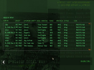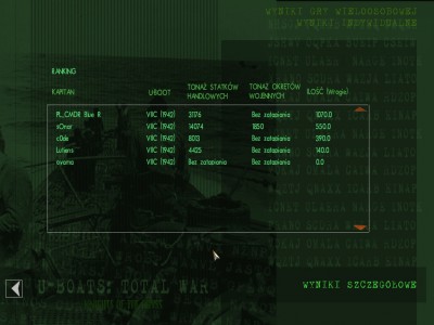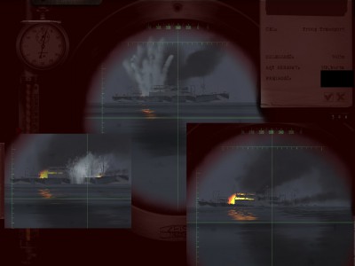 Wszedłem po cichu do konwoju. 2 torpedy w Troopa i zaczął się składać... T3 był już wybredniejszy i dopiero po 3 stanał i po 4 zszedł. Wtedy mnie pierwszy raz wykryto. Przy taranowaniu, które.... urwało mi główny peryskop. Dalej ścigany ukryłem się za wrakiem, a po przeładowaniu torped zdjąłem kolejny tankowiec. Wtedy to też zaatakowano mnie niszcząc połowę baterii i silników elektrycznych... Po naprawach, na 2/3 mocy i jednej śrubie (1/3 mocy?) dopełzłem do wraku, gdzie znalazłem schronienie...