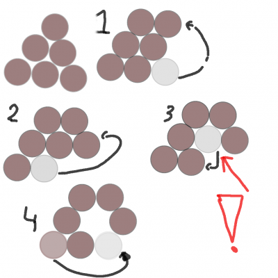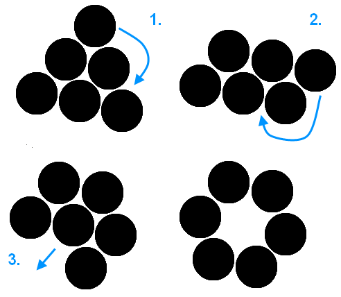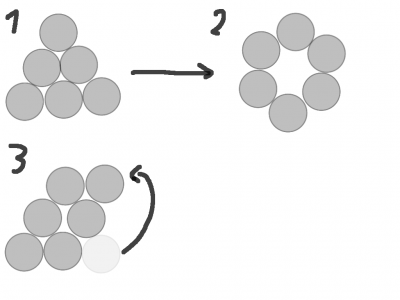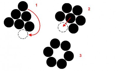Układ 6 monet (rys1) przekształcić w układ jak na nr 2 . Mamy do dyspozycji tylko 4 ruchy . W każdym ruchu możemy przesunąć tylko jedną monetę ,tak aby zawsze stykała się z dwoma pozostałymi (rys 3)