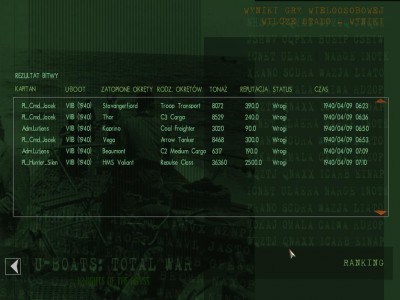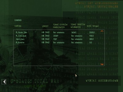 Co tu dziś dużo pisać. Płynę przed siebie 18 w. Widać dymy, zanurzenie i powoli 2-3 w. wpływam do konwoju. Jestem jakieś 1,5-2 km. od pierwszego handlowca i nagle pingi, za mną niszczyciel mnie wykrył. Posłałem mu rybkę, ale nie trafiłem, za to on trafił mnie. Żyłem jeszcze ale miałem 22% integralki na 40 metrach. Szasowanie nic już nie dało. Zgubiło mnie to, że sądziłem, że w 1940 nie trzeba być tak ostrożnym jak w 1944.