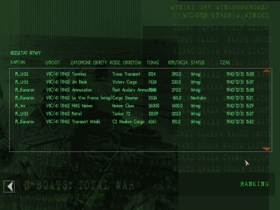 Dla śmiechu na kilka minut przed końcem wynurzam się i płynę na handlowce. Przepływałem obok naszego gdy był koniec patrolu. No to do abordażu Mam na celu jakiś mały handlowiec i jedną torpedę w wyrzutni przeładowaną, puszczam na oko i trafiłem Potem taranem go i wykończyli go handlowce. Eksplozja mnie nie zniszczyła mimo, że byłem do niego jeszcze przylepiony Potem kilka razy oberwałem i było po zabawie