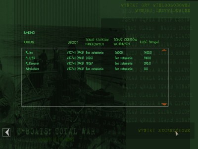 Patrol zaczelismy w poblizu pewnych jednostek. Hydroakustyk melduje, bardzo podekscytowany o wielu okretach. Zalewamy wszystkie wyrzutnie. Podnosimy delikatnie peryskop. A tam... "Hipper" . Dobrze, ze polityczny zostal w porcie. Hydro rehabiltuje sie pare minut pozniej wyluskujac z tla konwoj. Szybki rzut na dane wywiadu. Wszystko sie zgadza. Rysujemy linie "Finka" i tamze sie kierujemy. Zaoczamy spora gore lodowa, zanurzamy sie. Rychlo w czas. Dwa DD'ki wyskakuja z mgly, szukajac czegos ciekawego. Schodzimy na 100m i przechodzimy pod eskorta, przy okazji delektujac sie hiper dokladna analiza pogody, zaprezentowana przez naszego nawigatora. Jak on to robi 100 metrow pod woda? Czujac sie w miare bezpiecznie, zaczynamy sie powoli wynurzac. Podnosimy delikatnie peryskop. Coz, za perfekcuja pozycja. Tuz przed i miedzy srodkowymi kolumnami. Szybki przeglad celow. Oko kapitana spoczywa na znajomej sylwetce. Ksiazka rozpoznawcza laduje na podlodze. To chyba pancernik klasy Nelson. No, no alez ladny kasek podchodzi nam pod wyrzutnie. A z tylu amunicyjny. Chyba wygralismy szostke w totka. Pierwszy strzal, rufowa do amunicyjnego. "lubudubu". "Hurra", wrzeszy zaloga. Trafiony!. "K.....a mac" plynie. Mruczy kapitan. To nie trafienie tylko przedwybuch. Cholerne elektryki. Podobna sa teraz takie niezawodne... Nie ma czasu na zastanowienie. Pod wyrzutnie podplywa Nelson. Posylamy 3 elektryki, potem parowka. Dwa elektryki trafiaja, parowka wymineta zgrabnym zwrotem. Zaloga piszczy z zachwytu. Ciezkie uszkodzenia. Trafienie w rufe i pod nadbudowka. Tymczasem Nelona robi baczka... i zaczyna sie. Nasze sily atakuja. W konwoju rozlega sie pieklo, a kapitam myslili tylko.. "Cholera oby nie zatopili Nelsona". Topredowy szybko ladowac nastepne torpedy "Schnella, Schnella". Kolejna udaje sie zastopwac olbrzyma. Wszyscy obgryzaja pazrury. "Nie tonie!". "Szybciej, szybciej bo Hans z krazownika zwinie nam lup!" krzyczy kapitan. "Torpeda zaladowna". "OW namiar na nieruchomy cel". Torpeda opuszcza wyrzutnie i szybko zmierza do celu. Pioropusz wody okrywa pancernik. "Trafiony!!" Tym razem na dobre. Pancernilk majestatycznie pograza sie w falach Morza Arktycznego.