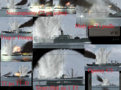 Wkrótce zauważał konwój i zatapiam na początek jedną C2. Tesiu zaskoczony jego zatapialnością, ale już mu się nie podoba, że konwój się zapętli. I rzeczywiście. Zrobił 1 pętelkę, ale potem wrócił do normy. No to dokonuję ataku. Tesiu też dołącza topiąc swoje jednostki... Uszkodziłem C3 i czekam na przeładunek, gdy mnie wypingowali. Wolałem nie ryzykować walki i zwałem na głębinę. Olek stanął na wysokości zadania i dobił cel.