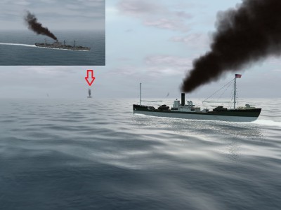 Idę do konwoju. Szeroki namiar na hydro, a wiec jest blisko. UnnAmmEdd nie dostrzegł tego i wynurzył się. DD z radarem (chyba 1 był tylko) zebrał 2 kumpli i popłynął do niego topiąc go. Ja słyszę szum torped od konwoju. Albo to torpedy UnnAmmEdda płynęły.