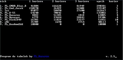3. Lubię niebieski i gdy go pisałem na forum byłem jeszcze na niebiesko Gdybym teraz pisał nowy program (tego nie zmienię, jest konsolowy i napisany w Pascalu, z którym już całkowicie skończyłem), oczywiście tym razem w Visual C# (więc program formularzowy) tobym się podpisał na zielono W sumie teraz gdy znam klasy, metody i generalnie programowanie obiektowe to szłoby w miarę szybko taki program napisać. Ale na razie skupiam się na pisaniu gry.