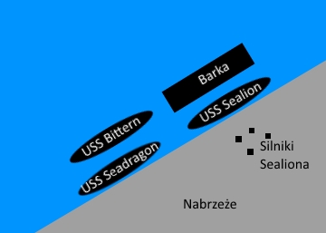 Kapitan Kanaron wyjrzał zza silnika. Okręt baza USS Otus odbijał od nabrzeża na którym wciąż znajdowała się duża ilość zaopatrzenia, odgryzając się samolotom, które próbowały go zatopić. Trałowiec Bittern oraz stojący obok USS Seadragon prowadziły ogień. Czerwony smok morski, wciąż nie był w pełni pokryty farbą, a puszki z farbą i rozpuszczalnikiem ciąż znajdowały się na pokładzie. Zaraz obok USS Sealion prowadził ogień z wukaemu. Do przebiegnięcia zostało kapitanowi tylko 30 metrów.