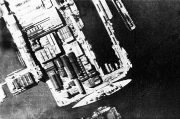 The British were aware that Tirpitz was working-up in the Baltic, and the three major base ports of Kiel, Gdansk and Gotenhafen (Gdynia) were all regularly photographed by reconnaissance aircraft. In this view of Kiel, the camera has recorded not only Tirpitz, but also three Type VII U-boats (left), a 280-foot auxiliary alongside the wall, and two floating docks (upper right).