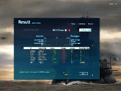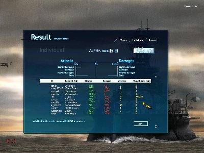 ..Nuuudnie podejscie... Nagle, 2 suby wylaniaja sie na "drugiej". Wspolnie z drugim subem zawracamy na przeciwnika (IJN2 i KM1). Krotka potyczka IJN'ow ,bez rezultatu, oba zrobily criticala. Wykorzystujac okazje odczekuje chwile i wypuszczam 2 rybki w strone orientacyjnej pozycji IJN'a. Coz za pech, akurat chloptas wyszedl z criticala. 1 rybka wystarczyla. Tymczasem 2 sub stara sie mnie sciagnac. Szybko odpalam 2 rybki, z ktorych 1 trafia i zatapia wroga. Drugi nasz sub nadaje pochwale - fantastic job!! - szkoda, ze nie wie iz to moj 6 (szosty!) rejs. Skuteczna akcja otwiera nam to droge do wrogich BB. Przyjaciel, swoim IJN'ewm szybko kasuje 2 BB'ki. W miedzyczasie jestesmy nekani przez eskorte. Pocztyczka POW - Yammy konczy zatopieniem POW'a i czerwonym paskiem Yamy'iego. Na szczescie znajduje sie na dogodnej pozycji i dobijam Yamy'iego. Niestety brak powietrza zmusza mnie do wynurzenia i walki z eskorta. Na szczescie panowie postanowili sie minac wprost przed moim dziobem, co skrzetnie wykorzystalem zatapiajac ich w tej samej chwili 2 torpedami, wywolujac 2 raz okrzyk zachwytu kolegi sub'a. Nasza radosc nie trwala dlugo, w krotkim odstepie czasu zatopil nas ostatni BB. Na pozegnanie zostawilismy mu zolty pasek. Ostatecznie kolega zobyl 81k a ja 28k ataku.
