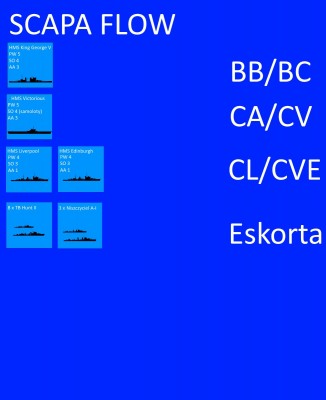 Scapa Flow X Task Force 3 X King George V, Victorious XX Task Force 4 X Brak XX Task Force 7 X Edinburgh, Liverpool X 3 DD A-I, 8 TB Hunt XXX