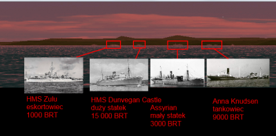 Obserwując sytuację z daleka zauważasz, że tankowiec wypadł z konwoju, ale przynajmniej 1 eskortowiec został z nim i pilnuje go, powoli wlokącego się do Wielkiej Brytanii.