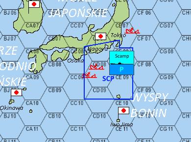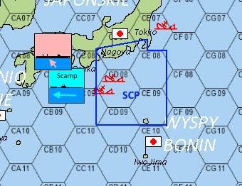 Chwilę później XO zaznaczył pozycję ataku na mapie. Grupa poruszała się z prędkością 25 węzłów (4 pola, dop. Finka) i jeżeli tylko zmierzali nie do Kure, a do Tokyo lub Osaki to Scamp był w stanie przeciąć kurs grupy. Niemniej dotychczasowy kurs z meldunku wskazywał raczej na rejs do Kure (CB07) lub na Morze Japońskie.