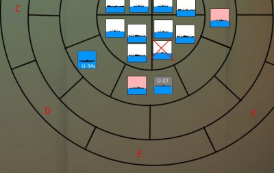 U-27 powoli zbliżał się do konwoju, oglądając się na eskortę, która cały czas kręciła się wokół konwoju. I rzeczywiście, wielka przestrzeń bez eskorty szybko "zapełniła się" eskortowcami, które najwyraźniej wracały na nowe pozycje po ostatnim zygzaku konwoju. Nagle w konwoju w górę wystrzelił słup ognia (zaznaczony X). Ktoś musiał trafić statek amunicyjny. Ogień, który pojawił się w konwoju ułatwiał atak, ale i eskorta była tego świadoma zapalając reflektory i wystrzeliwując flary. Z odległości (dalekiej) w jakiej znajdował się U-27 można było teraz bezpiecznie zaatakować, ale każda próba zbliżenia mogła doprowadzić do wykrycia U-Boota.
