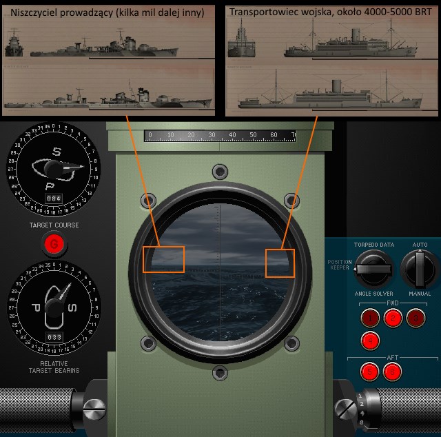 "Spokojnie. Siedzimy cichutko (1 w.) Maszyny gotowe do ostrego zwrotu w chwili gdy przejdzie nad nami plus 20 w dol. Wypuscic tez " brune skarpety George'a" zurzty olej z kuchni, maszynowni I reszty okretu I kazdy dostpeny smiec. Po manewrze cisza jak makiemm zasial I jak bedzie w miare bezpiecznie, powoli oddalamy sie I podnosimu 30 do gory. trzeba miec margines na kolejny atak."