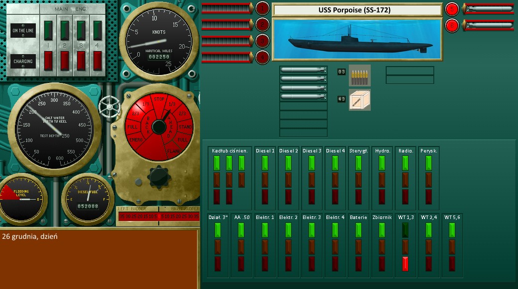"Dobra robota chief. Wracamy na bezpieczna glebokosc, tj. +-240. Czy damy to zrobic bez zbednego halasu? Jak ster damy rade odblokowac? (jak Finek zruca kostka to penie nie ) Czy mozna przynajmniej recznie przestawic w polozenie neutralne. Jak nasz przesladowca, zgubil nas? Pierwszy wystrugaj jakis kurs odejscia, zjezdamy stad."