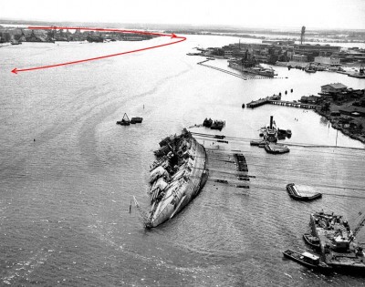 Ci marynarze, którzy jeszcze nie widzieli Pearl byli zszokowani widząc w porcie wraki pancerników z pamiętnego dnia. Ten widok musiał burzyć w nich krew. W oczy rzucała się zwłaszcza Oklahoma, otoczona żurawiami, podnoszącymi okręt z dna basenu portowego, a także zanurzony kadłub Arizony, widoczny nieco dalej od idącego do bazy okrętu podwodnego,