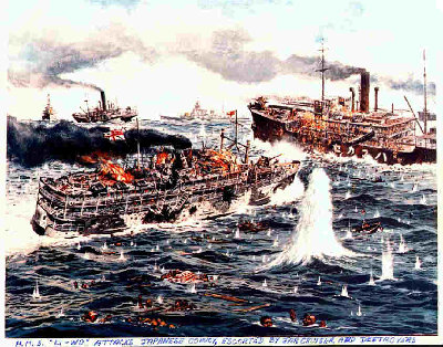 Nad ranem pojawiły się na niebie japońskie bombowce, które sprowadził gdzieś z północy ten przeklęty komin.. Nurkowały kilkakrotnie, ale „ Li-Wo” przy wszystkich swych wadach, okazał się statkiem zwrotnym i bomby zawsze szły w wodę. Było po pierwszej, gdy daleko na południu ukazały się maszty, a później sylwetki kilkunastu okrętów, które poczęły rosnąć w szkłach lornetki dowódcy. Jeśli Wilkinson i jego pasażerowie mieli jeszcze jakieś wątpliwości co do kraju, z którego te okręty pochodziły, to rozwiane one zostały w sposób oczywisty, gdy w odległości 200 metrów od „ Li-Wu” pojawiły się fontanny wody. Na horyzoncie płynął w stronę Sumatry konwój japoński, eskortowany, ni mniej ni więcej, tylko przez krążownik. Wilkinson zdawał Sobie sprawę, że ze swym archaicznym pudłem nie wymknie się Japończykom. Zdecydował się jednak drogo „sprzedać swoją skórę”. Kazał załadować działo, zrobił zwrot w stronę przeciwnika, i „Li_wo”, wyrzucając potworne kłęby dymu, pełną parą ruszył kursem na zbliżenie. Artylerzyści dali ognia w stronę pierwszego z prawej transportowca, i ku fantastycznej radości całej załogi zapalili go piątym strzałem. Tymczasem krążownik wziął „ Li-Wo” najpierw w duże, potem w małe „widły” wreszcie zaczął go trafiać. W pokładzie i burtach powstały ogromne otwory, po kilkunastu minutach runął maszt, ale maszyny jeszcze pracowały. Konwój japoński rósł w oczach. Wilkinson kazał posłać krążownikowi ostatnie granaty i skierował okręt w stronę uszkodzonego, płonącego transportowca japońskiego. Dopadł go ostatkiem pary w kotłach i staranował. Japończyk począł tonąc, a „Li-Wo” został w tym momencie dosłownie wyrzucony z wody salwą krążownika, oddaną z najbliższej odległości. Jego walka trwała półtorej godziny...