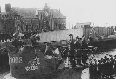 Ten uszkodzony okręt wracający do portu to U-46 Engelberta Endrassa. Zdjęcie zostało wykonane w Lorient 13 czerwca 1941r. Endrass został staranowany przez brytyjski zbiornikowiec "Ensis", którego wcześniej uszkodził, a później zatopił ogniem z działa.