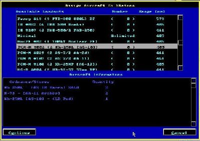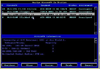 UWAGA!!! Możemy także przezbroić nasze jednostki w uzbrojenie adekwatne do charakteru danej misji ( nie użyjemy przecież migow-23 BM uzbrojonych w rakiety powietrze-ziemia/woda do misji CAP ) aby dokonać przezbrojenia jakiejkolwiek jednostki, zaznaczamy ją w oknie wyboru, po czym naciskamy przycisk READY ( zdjęcie nr. 10a ) Otrzymamy nowe okno - OKNO UZBROJENIA. Tam będziemy mieli wszelkie możliwe konfiguracje uzbrojenia dla danego typu samolotu ( zdjęcie 10b ). Gdy zdecydujemy się jak go przezbroimy naciskamy przycisk CONTINUE i wróciliśmy do okna wyboru jednostek.