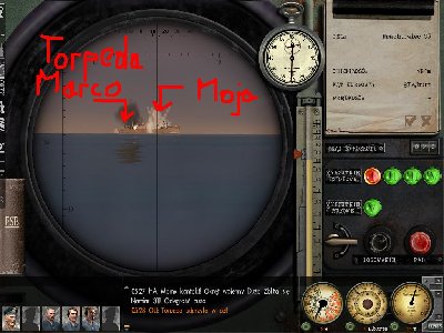 C3 zaatakowałem z daleka. Na przybrzeżnego wpadłem, gdy wychodziłem na peryskopową... Fregata, która zatopiła wilka stała dokładnie między mną, a konwojem, uniemożliwiając mi dobre wejście. Jeszcze po zatopieniu z daleka C3 okazało się, że konwój się rozproszył. Z mojego punktu widzenia wyglądało to, że konwój skręcił i za chwilę będę na flance. Musiałem zaryzykować. Prawie mi się udało. Udało mi się uniknąć fregaty, ale nie tego niszczyciela, co szedł jej na pomoc. Zagoniony na 180 metrów przeładowałem 2 torpedy i wyszedłem... wprost na płonącego mercha. Prawie bez liczenia go storpedowałem. W sumie chyba nawet był błąd pomiaru.. Ale trafiłem. Potem razem z Marco próbowaliśmy jeszcze zatopić małego tankowca, ale uciekł nam obu...