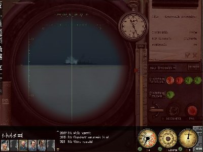 Zostałem wykryty podczas podejścia, ale wcześniej zdołałem osiągnąć 2 trafienia krążownika pomocniczego z 4km... Ale jedno okazało się niewypałem. Poza tym trafiłem Hunta, który... odpłynął? A może to była przedwczesna <hmmm>... Zanurzyłem się na 180 metrów, przeładowałem 3 torpedy, po drodze straciłem rufowe stery i nabrałem trochę wody. Wyszedłem po raz drugi... Prostopadle do kursu konwoju na ostatniej linii... Spróbowałem trafić transporter wojsk, ale niestety.... torpedy nie trafiły. Za to wykryto mnie i znów uszkodzono. Znów zeszłem na 180 metrów (dno) i nagle moja torpeda coś trafiła. Zupełnym przypadkiem DD był na drodze.