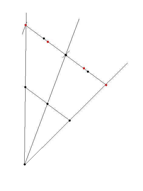 - Potrzebuję 3 namiary w równych odstępach czasu aby geometrycznie wyznaczyć kierunek w którym przemieszcza się cel. Rysuję je na mapie taktycznej, a następnie wyznaczam, z nich kierunek przemieszczania się celu. Muszę znaleźć taką prostą, która będzie dzielona przez namiary na równe części (jak na szkicu). Nie znam dokładnie odległości, tylko kierunek.