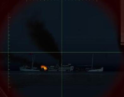 Ruszam w pościg za kolejnym dymem , widzę tylko rufę i rozpoczynam ostrzał, ogień pojawia się na nadbudówka, jeden komin zdemolowany, ale ...... czerwony krzyż, przerwać ogień .