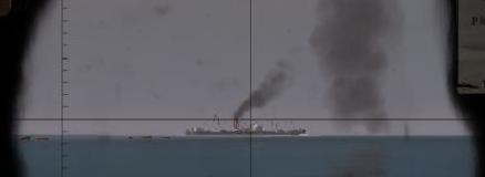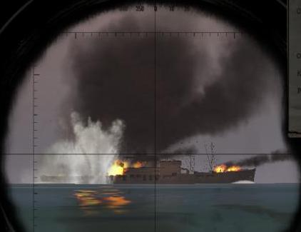 Ale wracając do tematu przycelowałem najpierw w jeden przybrzeżny frachtowiec, ale torpeda wybuchła za wcześnie. Potem ruszyłem w kierunku Troop Shipa. Jednak najpierw w celownik wszedł mi kolejny frachtowiec, którego zatopiłem (niestety gra mi go nie zaliczyła). Kolejne dwie rybki ubiły Trupa. Ostatnią puściłem z odległości ok 2,6 km do parowca. Torpeda trafiła pod drugim masztem, ale tylko spowodowała przechył .