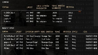 Ustawiłem się, czekam. Przeładowali kolejne 2 torpedy. 1 Torpeda. Dostał w rufę. No to druga ciut szybciej... Nie trafiła.... Została 1 torpeda, a Dido pod dzikim kątem. Nagle dostaje od kogoś torpedę i tonie. Cobra go dorwał. Nagle "Torpeda trafiła w cel". Patrzę. Daleko ode mnie, jakiś frachtowiec dostał torpedę i zaczyna tonąć... 2 na tym patrolu torpeda "przypadkowa". Obserwuję tonącego Didusia. Ma urwane śruby. A więc dobrze widziałem, ze trafiłem. W porcie pogadamy o tonażu... Cel: T2. No to 2xT2 do T2. Przedwczesna i niewypał. O, żesz kurcze.... Patrzę. Na końcu płynie fajny, mały frachtowiec. Pora na Crazy Finek'a... Patrzę na zegar. 5 minut? Kurcze, a ten fracht, którego mijam ma działo... Jakby misja trwała jeszcze 15 minut... Obracam peryskop... CO W KONWOJU ROBIĄ DD OD KENTA?! Widzę tego, co został zbombardowany. Dobrze. Pewnie kogoś gonią... I to w 2 miejscach? Gonią 2 osoby.... 3 minuty....120 sekund.... minuta.... 30 sekund...."PL_Cobra opuścił grę" "Cobra, co się dzieje?" "Bez komentarza". "Zatopili cię?" Potwierdził.