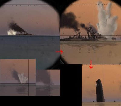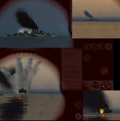Po cichu....... po wielkiemu..... cichu..... Płynę. Widzę pancernik. To mój cel. 3 węzły. DD się zbliża... 1 węzeł... KURNIA!! Idzie na mnie... Minął mnie o 100m. Wynurzam peryskop. Cele zygzakują... rufowa do pancernika. Trafiony. Obrót. 3 torpedy do celu. Obie trafiły. Tonie. No to ostatnia torpeda do Kenta. Trafiony.