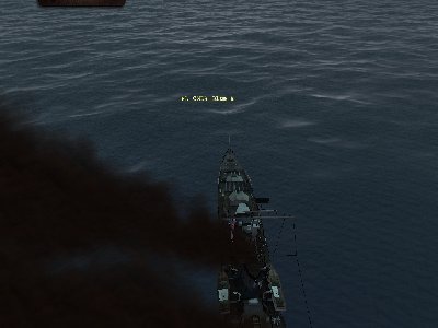 1h gry. Z mgły wyłonił się konwój. Jestem na jego flance. Wchodzę tak szybko jak to możliwe. Zbliża się DD płynący na flance. Zwalniam. 2 torpedy do ciężkiego frachtowca... 1 trafiła. Stanął.... Przeładowanie.... Wtedy nagle otrzymałem komunikat. Trafiono cel! Trafiłem płynący za nim Passenger/Cargo. 1xT2 i 1xT1 do dobijania. Obie jednostki zatonęły. Jednak jestem za konwojem. Zaraz... Dlaczego ten liniowiec tak gna? Patrzę. Konwój skręca! Znów jestem na flance!