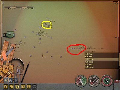 Stanąłem na rozdrożu. Jak teraz obronić konwój? Wysłałem 1 DD, aby krażył pomiędzy konwojem, a zatopionym parowcem i "odstraszał" Matrose, którego spodziewałem się w tamtym obszarze (czerwony), podczas, gdy Matrose... cały czas był w jednym miejscu (żółty). Torpeda, która zatopiła cel okazała się spudłowaną...