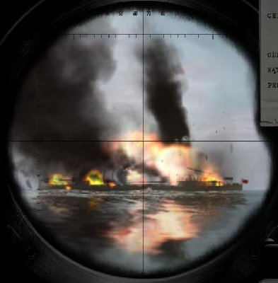 Minąłem eskortowce i zaatakowałem konwój. Zmarnowałem 3 torpedy, zanim nie spostrzegłem się, że nie włączyłem TDC . Potem już było troszkę lepiej i na dno posłałem dwa statki i niszczyciela. Konwój szybko płynął i wkrótce zostałem sam.