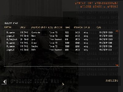 Patrol rozpoczęliśmy na powierzchni w godzinę duchów. Warunki sprzyjały więc chyba wszyscy zrobiliśmy podejście do konwoju na powierzchni. Po zauważeniu dymów, peryskopowa i oczekiwanie. Delikatna korekcja kursu i w sumie nie musiałem nic więcej robić. Wybierałem kolejne cele, ale pudłowałem niemiłosiernie. Pierwsza T3 zeszła po trzech torpedach. Rozglądałem się za tankowcami. Wokoło same C2, C3. Jakiś troop się przypętał. Trafiłem go jedną rybką. Popłynął dalej. Ktoś go później dobił. Mnie udało się jeszcze dorwać dwie T2. Potem uczepiłem się jeszcze jednej, którą zraniłem. Goniłem za nią do końca patrolu. A za mną goniła korweta. (pozbyła się na mnie chyba wszystkich bomb). Zostało jej tylko taranowanie i ostrzeliwanie z działka. Porysowała mnie na 92% integralności. Na koniec do T2 którą goniłem posłałem rybkę. Wybuchła przedwcześnie. Chyba pierwszy patrol, w którym pozbyłem się wszystkich torped. Ostatnie minuty przeczekałem na 50-ciu metrach z kpt. gregorym.