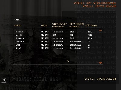 Dobrze pamiętałem, że już płynąłem ten patrol. Wtedy poległem. Tym razem podszedłem zbyt blisko niszczycieli, jeden spostrzegł mój peryskop no i się zaczęło. Pingi i bombki prawie do końca. Cisnęli mnie strasznie. Jeden moment bardzo krytyczny, ale mechanicy na posterunku. A myślałem, że poprzedni patrol był trudny. Tym razem zniszczony: przedni pokład, działo pokładowe, antena radiowa i działko plot. Cały ten czas przesiedziałem na blisko 200 metrach. Pod koniec zacząłem ostożnie się wynurzać. Na peryskopowej ogląd sytuacji; dwa DD-eki w pobliżu, kilka statków z konwoju, najbliżej tankowiec T2. Jednego niszczyciela udaje się zdjąć. Strzały do T2, niecelne. Podpływa Clemson. Zainteresował się zatopieniem kolegi. Czas upływa nieubłaganie. Jedna rybka zdąży się załadować. Może uda się go dopaść. Czuję na plecach jego oddech. O dziwo, nie wykrył mnie. Jednak nie. Zmiana decyzji i celu, wybór - tankowiec. Nie ma czasu na zebranie danych; strzał z ręki. Niecelny. Uff. Koniec patrolu.