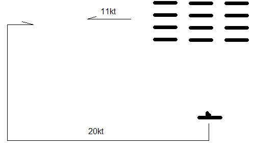 Mając dane prędkość konwoju i twoją + twoją odległość (11km) możesz wyliczyć precyzyjnie czas wyprzedzenia konwoju kursem równoległym.