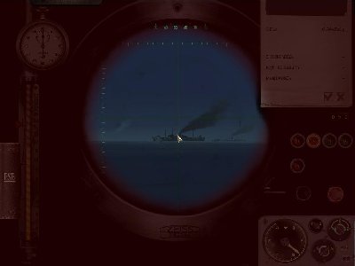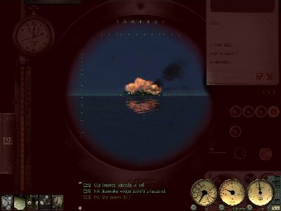 Zostały mi 3 torpedy... I tylko lotniskowiec co się zbliża... Prawie wpadam na czyjś peryskop (potem okazało się, że to Sęp i jeszcze się spotkamy)... Ktoś uszkadza lotniskowiec... To celuję w mały statek... Będzie ciężko... Czekam na pozycji... Kurcze już mam 2 torpedy, a od trafienia lotniskowca upłynęła masa czasu (jeszcze jak torped nie miałem). To dobiłem go, zapewniając, że się podzielę... I nagle zauważam peryskop... Pi razy firana na kursie torpedy! Na szczęście nie trafiłem swojego.
