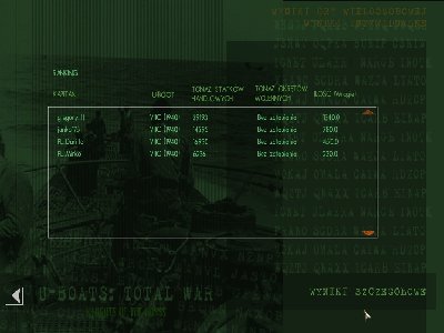 Patrol płynięty w okropnej pogodzie, do tego w ciemnościach. Prawie cały patrol przestałem, żeby mieć jak najjaśniejszy obraz. Mnie się podobało, chociaż trochę mnie oczy bolą. Pod sma koniec patrolu widząc szrżującego eskortowca zanużyłem sie. Niestety trochę mnie pocharatał. Mogłem zejść tylko na 60-70m. Co też uczyniłem. O dziwo nie trafiłem tylko dwoma torpedami. Wszyskie oczywiście puszczałem na kontakt. No i co godne zauważenia. WSZYSCY PRZEŻYLI.
