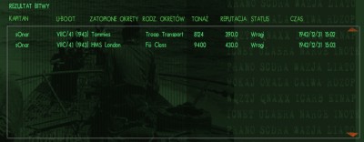 Długo grzałem do konwoju na peryskopowej. c0de lazł sobie na powierzchni, aż nagle go wywaliło. Jego truchło przyleciało obrzucić pięć 'suszarek'. Strzeliłem do Nelsona. Nie wiem czy spudłowałem, czy przeszła pod nim. Był wykalkulowany podwójnie dla pewniaka. 7,5W. Potem zrobiło się gorąco. Clemson męczył mnie strasznie. Wiejąc odpaliłem ryby. Trafiły w cel, aż Finek zagwizdał . Zwiałem na 150m. Po drodze w dół trochę mnie podrapali ale hull się utrzymał. Tam zostałem cicho zygzakując. Suszarki odpłynęły. Finek ogłosił koniec i zamknął serwer.