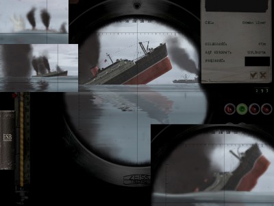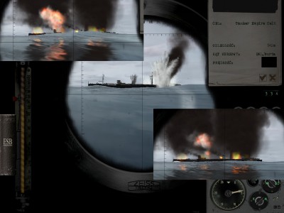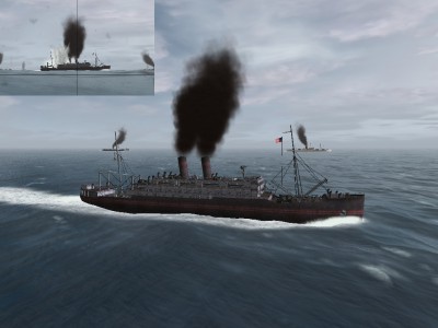 Trudno. Płynę z konwojem i ładuję torpedy. Mam 1 w wyrzutni, gdy frachtowiec zauważa peryskop. Nie jest dobrze DD sie zbliża. Szybki zwrot i 1 torpeda do liniowca. Dostał i szybko szedł na rufę. Prawie stał pionowo, a ciągle mogłem go zalogować. Co jest? Błąd i nie zaliczy? :schock Nie. Po chwili zaliczyło go (4.jpg)